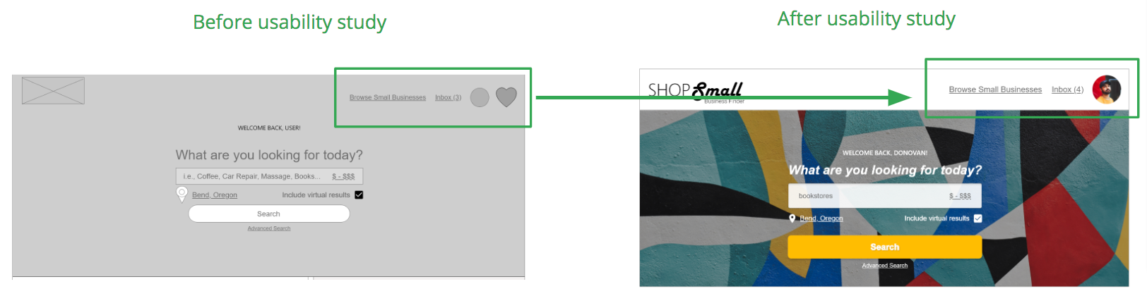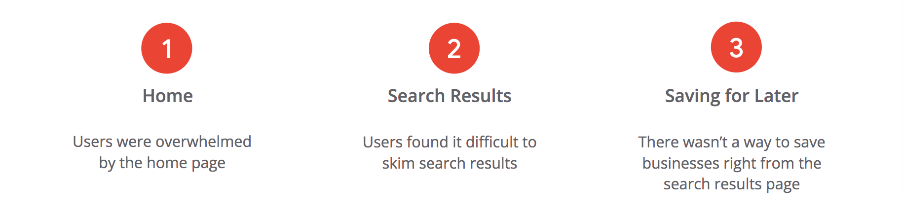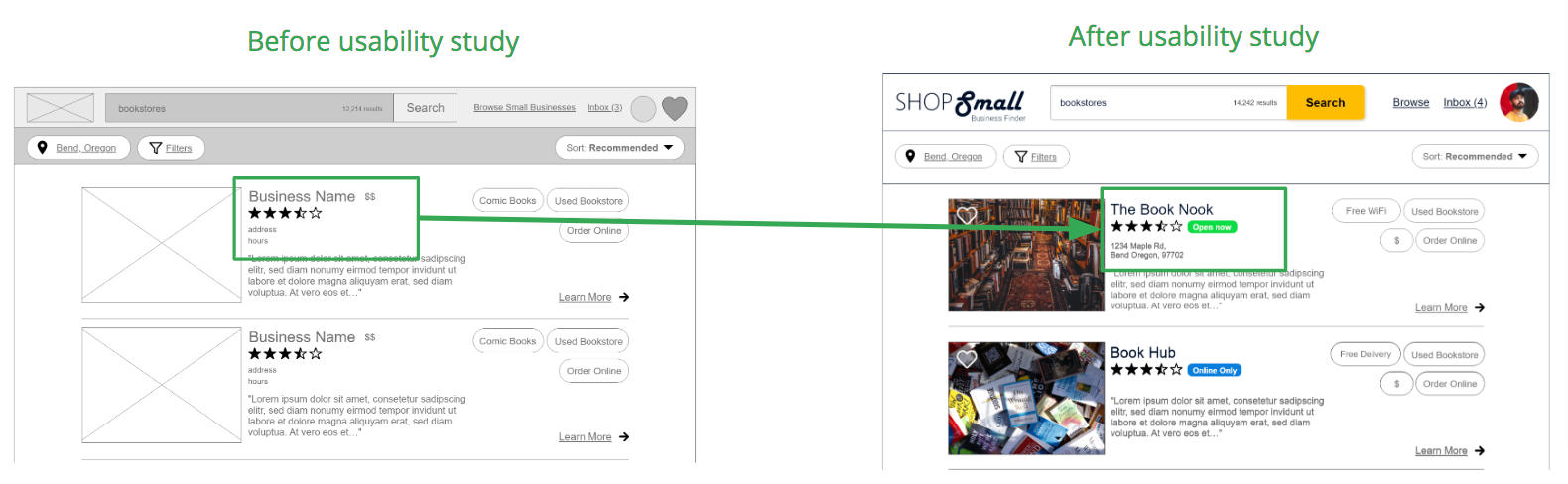 Based on the insights from the usability study, I made it easier for users to find out if a small business is currently open, closed, or online only by adding tags to the search results.