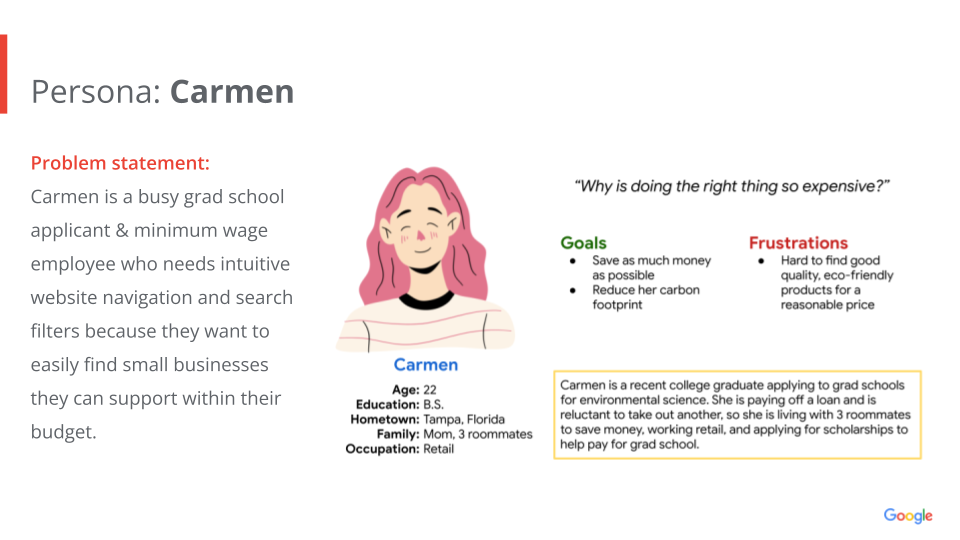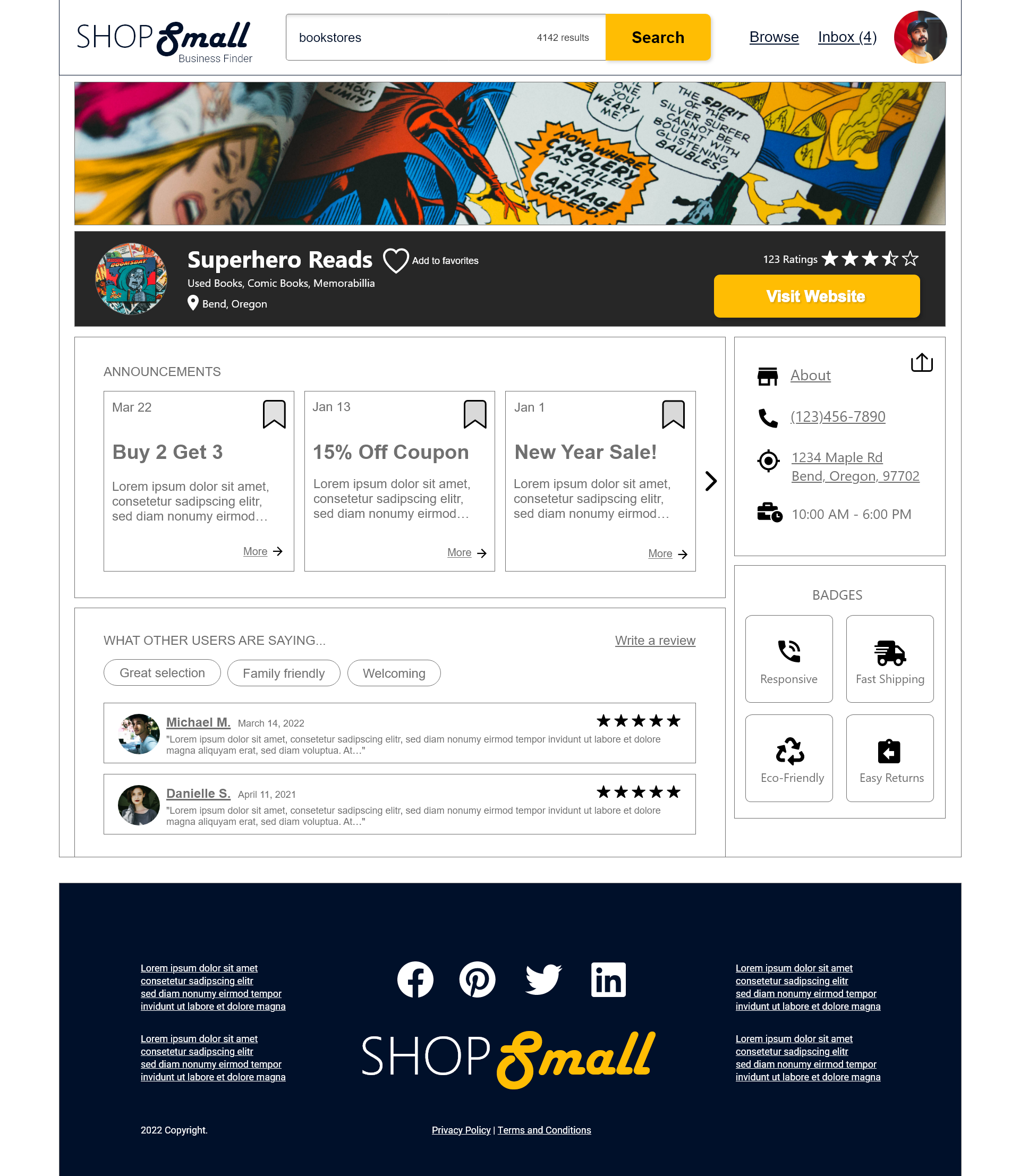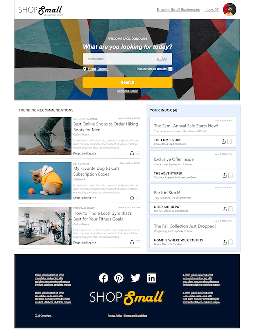 I conducted user interviews, which I then turned into empathy maps to better understand the target user and their needs. I discovered that many target users would like to support more small businesses, but have no way of finding a small business for everything they may need. This caused them to most often resort to shopping from large corporations for most items, even when they would prefer to support a smaller company that is more in line with their personal values.You can use this layout block as a little about me blurb or use it on top of projects to and add a description. To edit the copy, just click right in here.