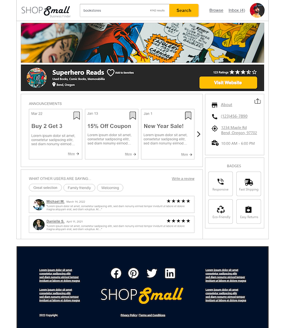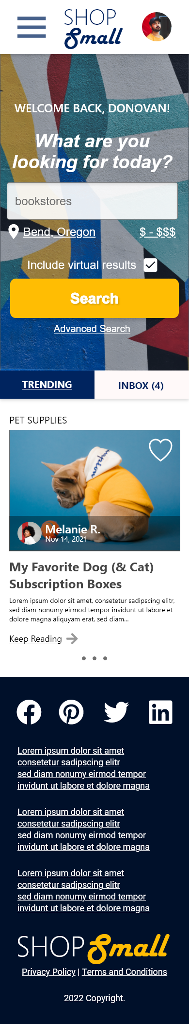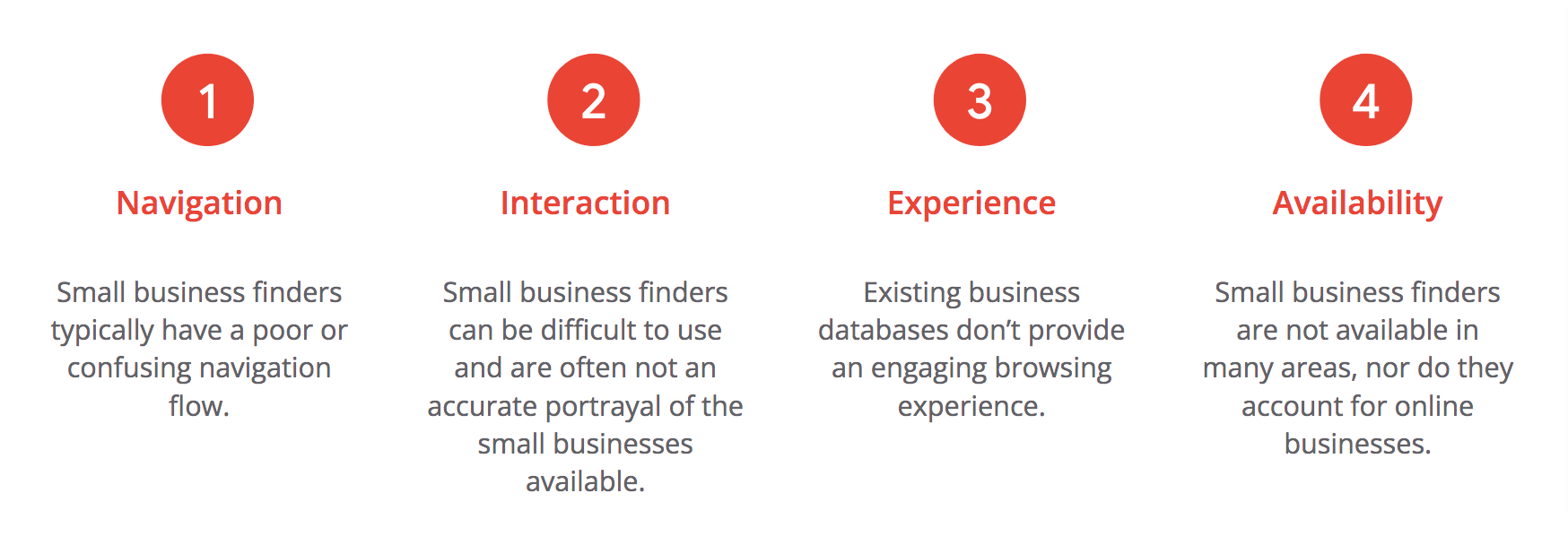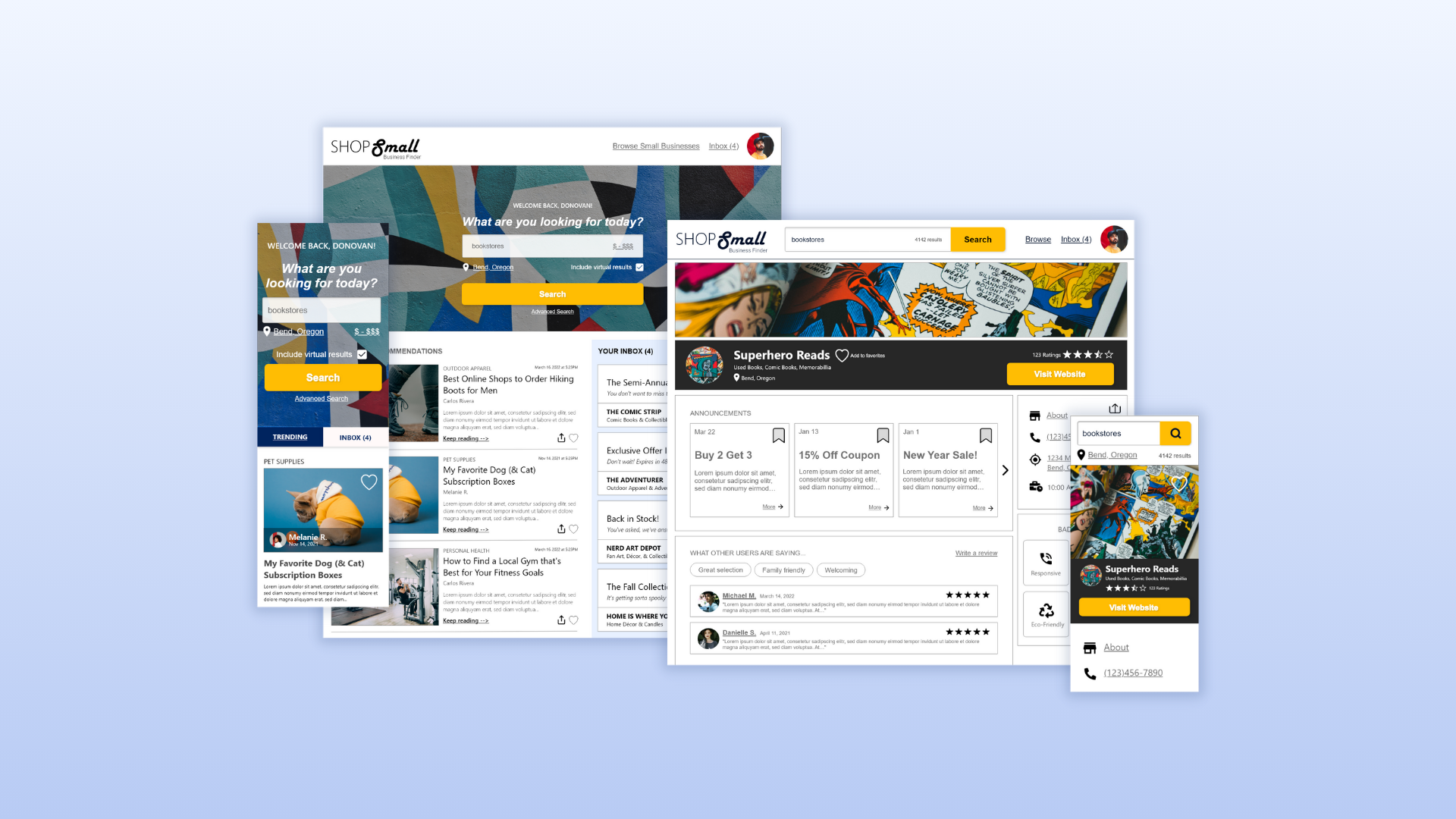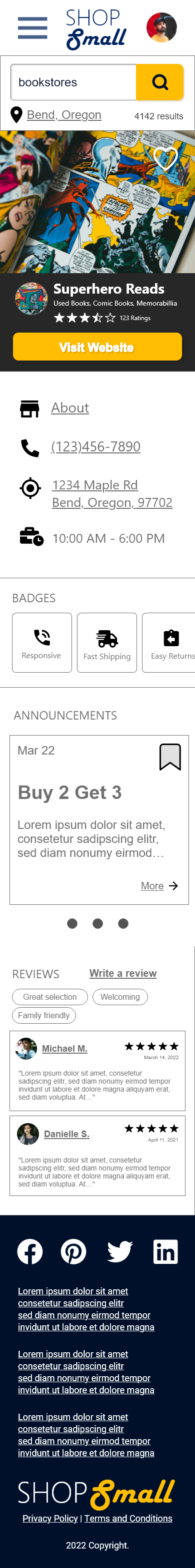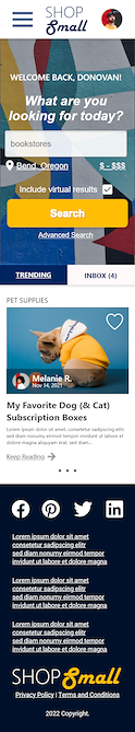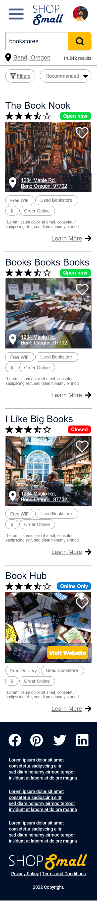 Shop Small is a small business finder. The typical user is between 19-35 years old, and most users are college students or early career professionals who prefer to support small businesses. Shop Small’s goal is to make it fun, fast, and easy for all types of users to find small businesses to support (both locally and online).