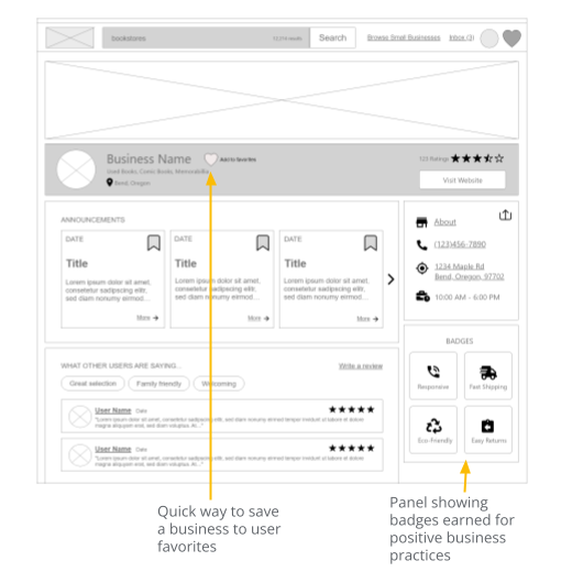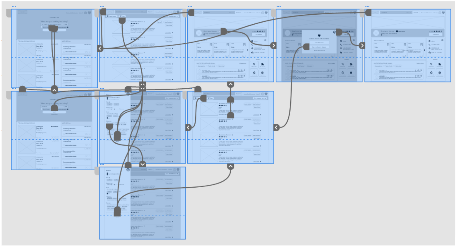 To create a low-fidelity prototype, I connected all of the screens involved in the primary user flow of searching for a business, filtering results, and saving a search result to favorites.At this point, I had received feedback on my designs about things like placement of buttons and page organization. I made sure to listen to their feedback, and I implemented several suggestions in places that addressed user pain points.