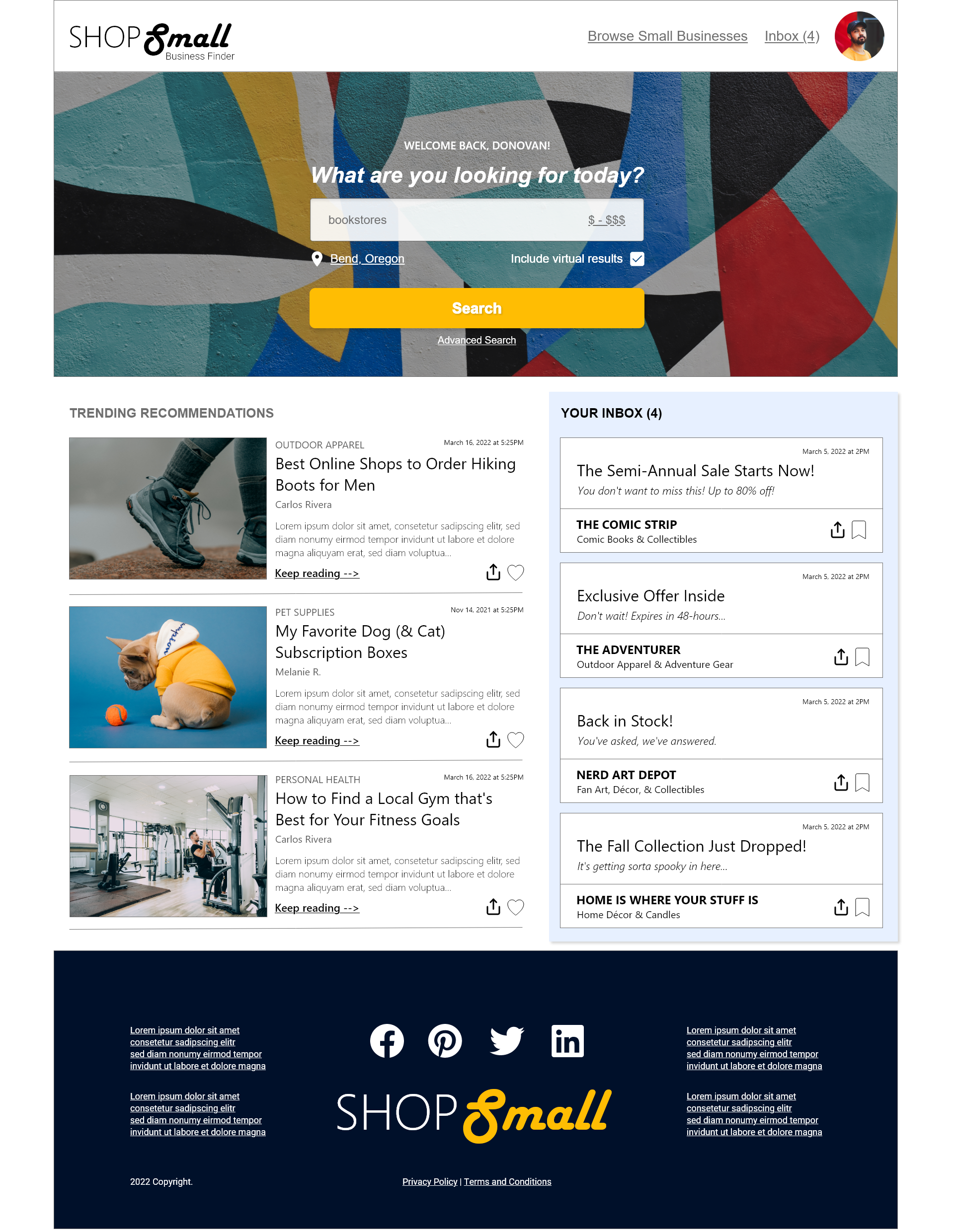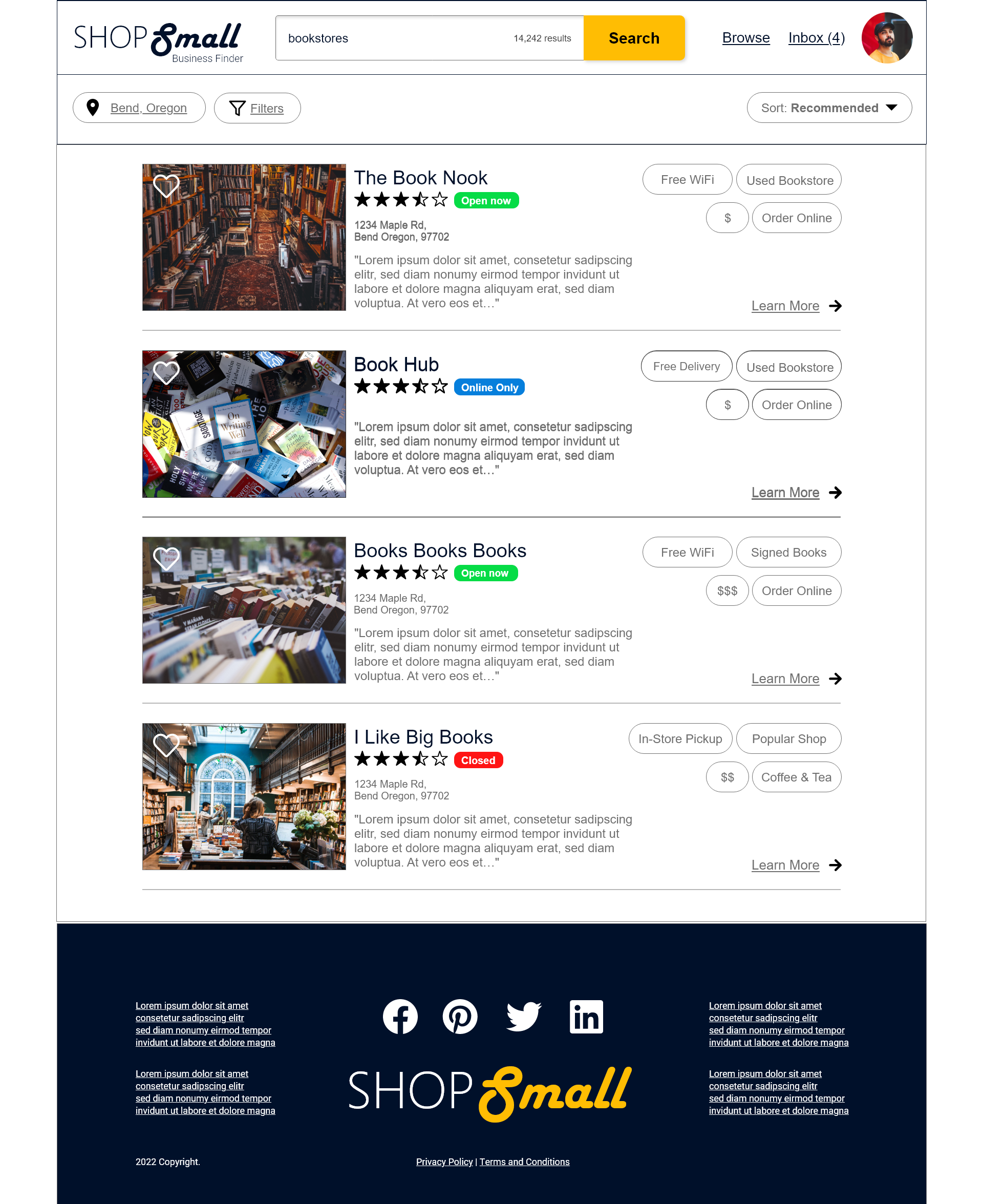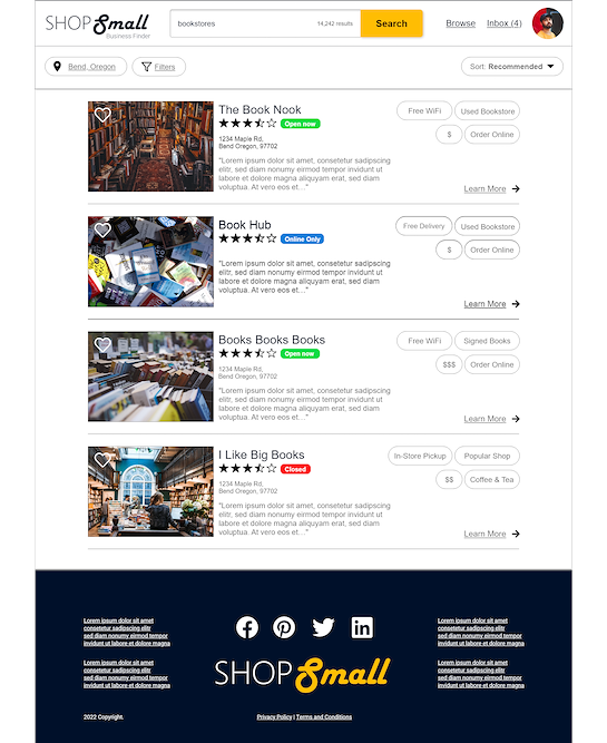 Design a searchable website for finding small businesses to support. It should be user friendly by providing clear navigation, offer highly specific filtration capabilities, and should eventually develop into a hub where small businesses can connect with potential customers by updating their profiles and sending offers directly to anyone who add the business to their Favorites.