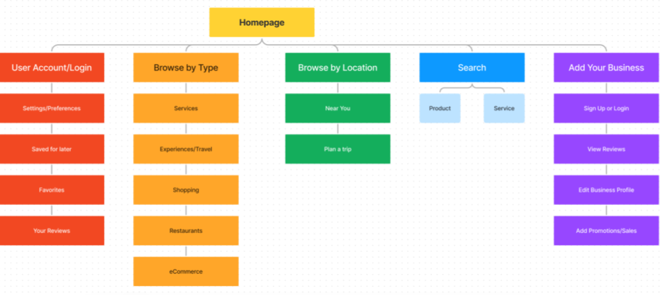 Difficulty with website navigation was a primary pain point for users, so I used that knowledge to create a sitemap. My goal here was to make strategic information architecture decisions that would improve overall website navigation. The structure I chose was designed to make things as straightforward as possible.Difficulty with website navigation was a primary pain point for users, so I used that knowledge to create a sitemap. My goal here was to make strategic information architecture decisions that would improve overall website navigation. The structure I chose was designed to make things as straightforward as possible.